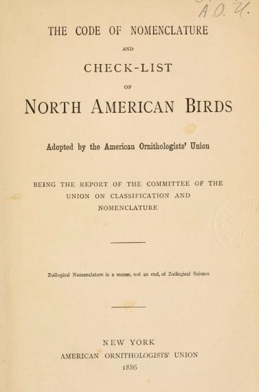 Document 1. The following citation is from The Code of Nomenclature and Check-List of North American Birds, Adopted by the American Ornithologist’s Union, Being The Report Of The Committee Of The Union On Classification and Nomenclature, published 1886; pages 20-21; Chapter II, Principles, Canons and Recommendations; Section A, General Principles; Principle V (Link).