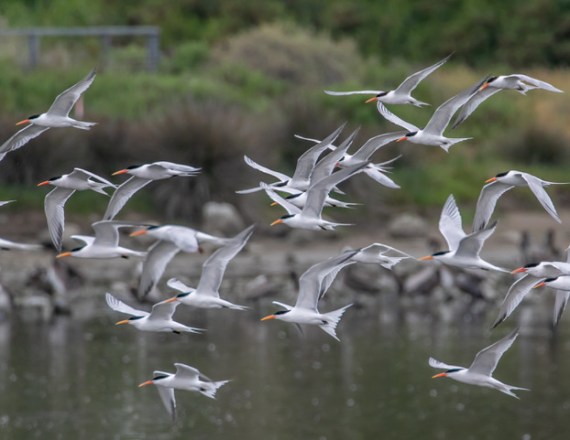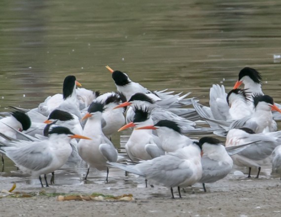 Elegant Terns with a few of the 348 Brown Pelicans in the fuzzy distance (Chris Tosdevin 5-26-24)