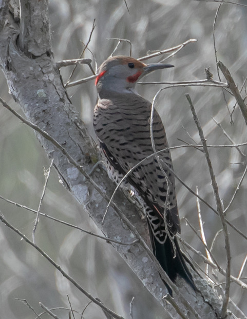 When a large bird flew in to land in the lakeside trees next to our lunch table, we immediately recognized it as a flicker, but not just any flicker. Judging by the head markings it was an intergrade. The western Red-shafted Flicker has a red “whisker” while the eastern Yellow-shafted has a black whisker and a red nape. This bird has both whisker and nape of red, not something you see every day. Judging by the very slim streak of lightness along the end of the lower edge of the wing, visible in the photo below, it may have had yellow feather shafts.