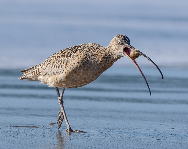 For example, a Long-billed Curlew about to swallow a Mole Crab. Notice the closed eyes, indicating a happy curlew.