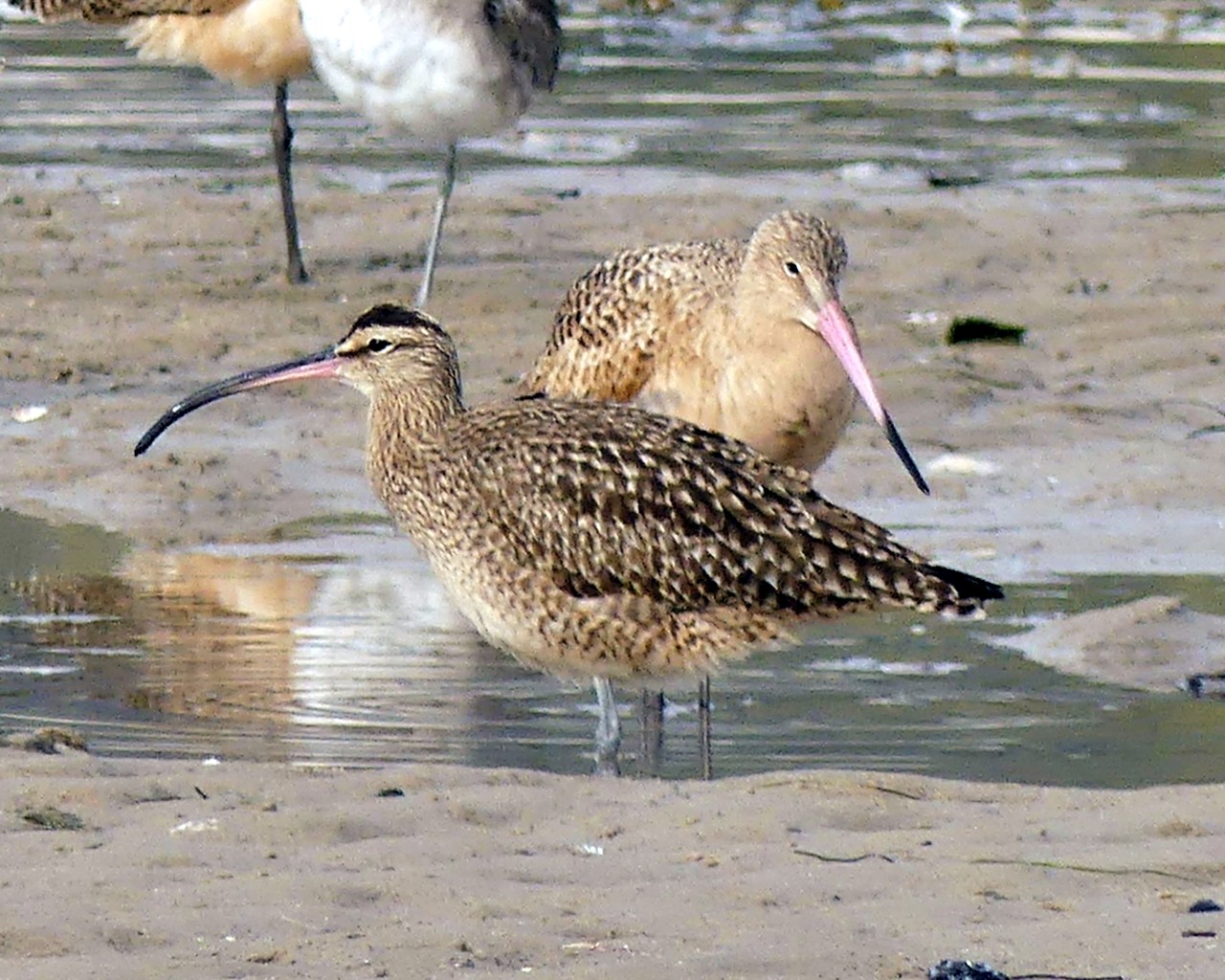 The day started chilly at 56°F and climbed only to 62° by 11am. The Snowy Egret above appears to be keeping warm by being extra fluffy. The Whimbrel and Marbled Godwit below are making their differences in plumage and bill apparent.