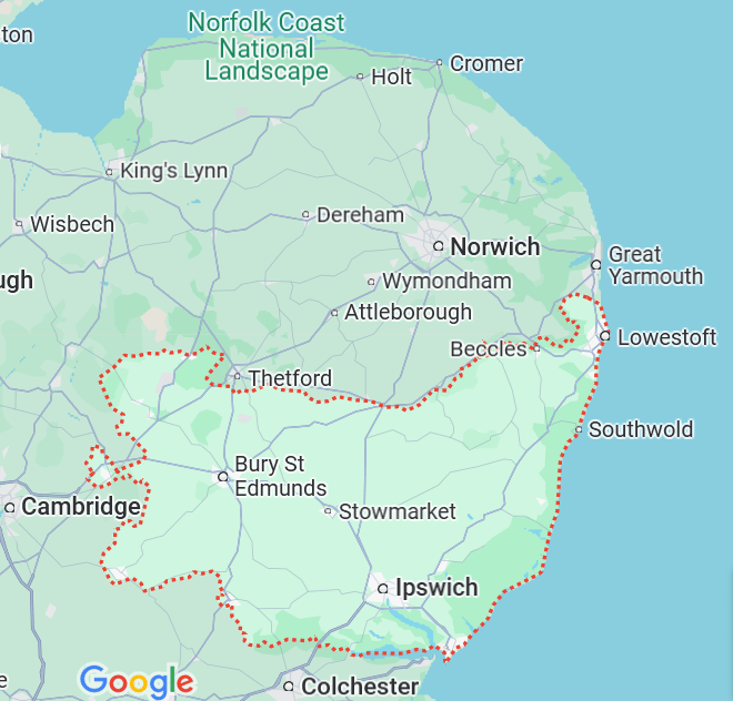 The region covered is roughly that between Norfolk in the north, Ipswitch in the southeast and a tad east of Cambridge in the southwest. Fine birding country.
