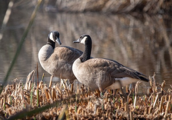 One of these two Canada Geese is obviously a lot larger than the other. Could the right-hand bird be the look-alike by relatively diminutive Cackling Goose, formerly considered as subspecies of the Canada?
