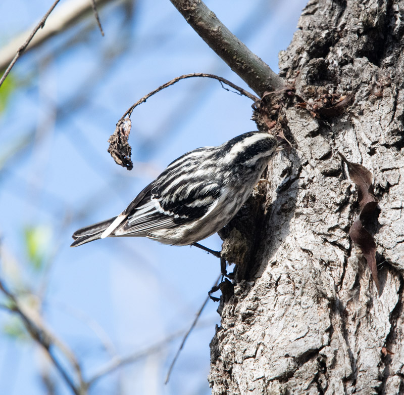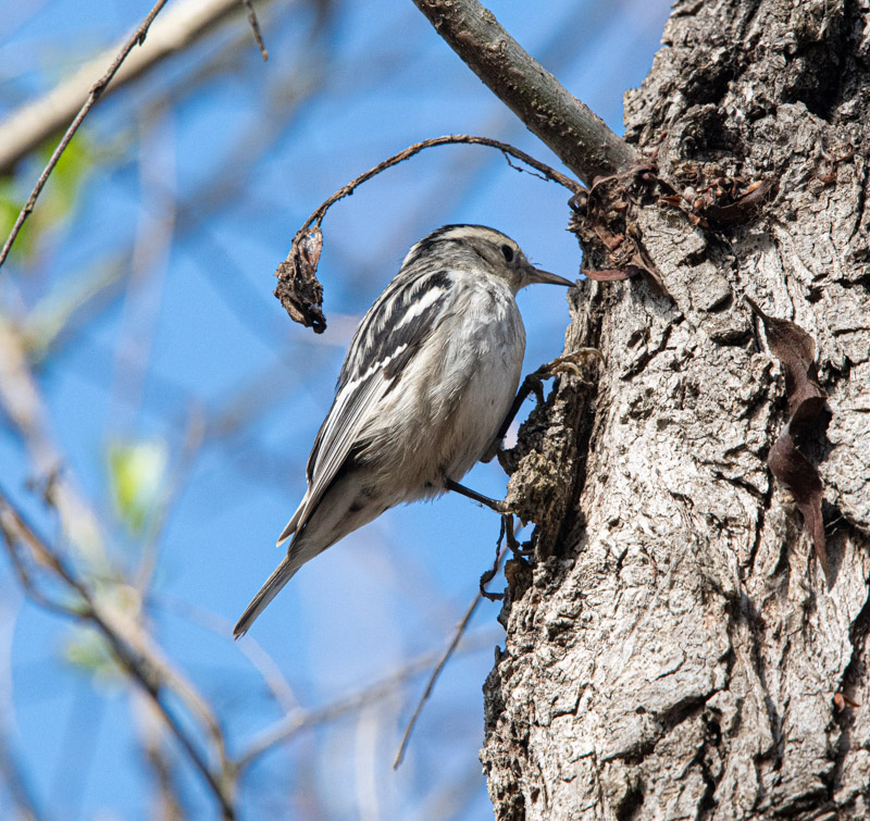 Black-and-white Warbler, gleaning from the bark, their typical behavior. (Ray Juncosa 2/8/25)