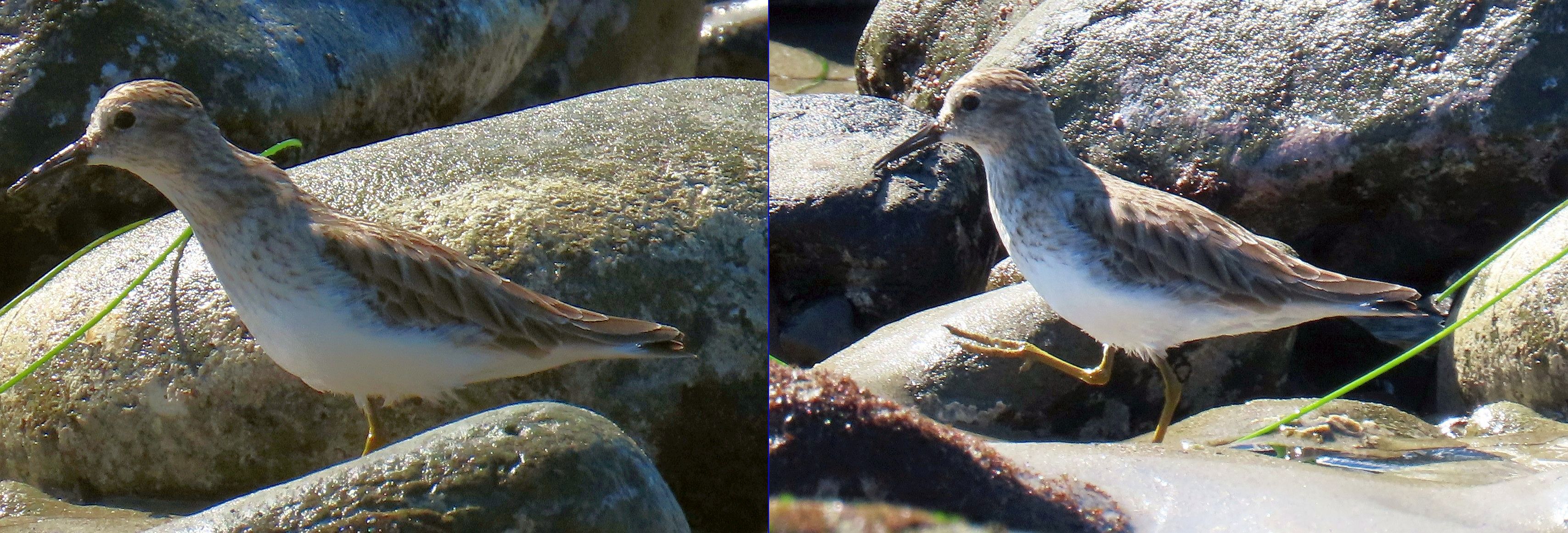 We had some brief semi-excitement down at the beach where the rocks were now exposed as the tide was withdrawing towards -0.4 ft. at 1:16pm. We spotted two sandpipers that looked a little odd. (And – of course – once again we were looking into the sun, unhelpful for viewing and photographing.) The birds – which kept disappearing behind boulders – looked an awful lot like Pectoral Sandpipers.
