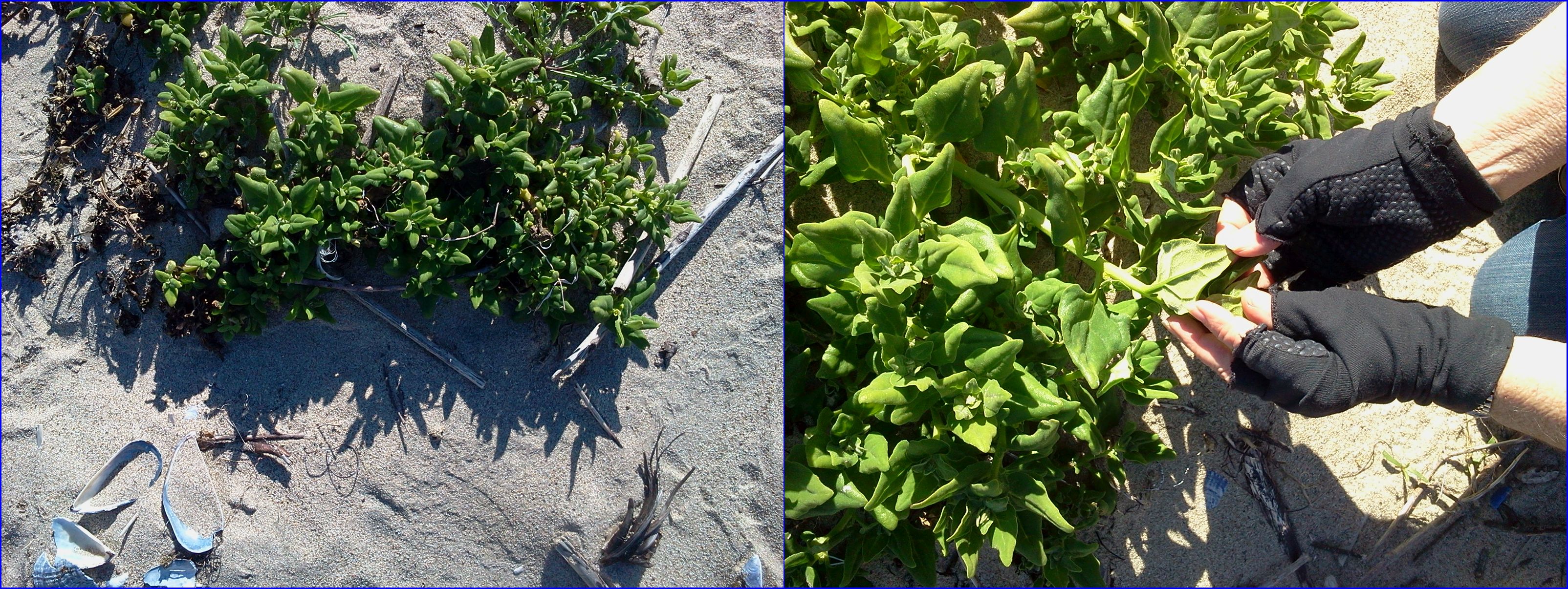 Our chapter plant maven Grace Murayama identified the plant below as Tetragonia tetragonioides or New Zealand Spinach (or Warrigal greens), a prostrate, sprawling plant in the fig-marigold family (Aizoaceae) used as a leafy vegetable and native to Australia and New Zealand. We originally thought it was some sort of Salt Bush (or Saltbush), most likely Atriplex lentiformes var. breweri, Brewer’s Salt Bush. The underside of the leaf had tiny salt crystals on it. I wonder if it floated across the Pacific or did some sailor toss his salad overboard.