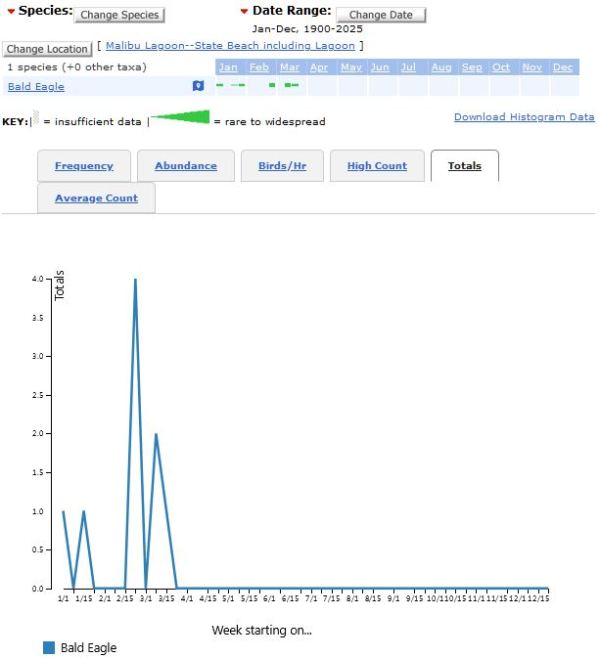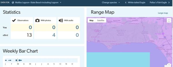 If there is some eBird maven out there who can demonstrate why I’m completely wrong and eBird is correct in all its presentations of the Bald Eagle sightings at Malibu Lagoon, please drop me a line and I’ll be happy to publish my errors and their explanation. Until then, I hope this is some extraordinary anomaly pertaining only to Bald Eagles and doesn’t mean the entire eBird system is shot through with bad coding and broken algorithms.
