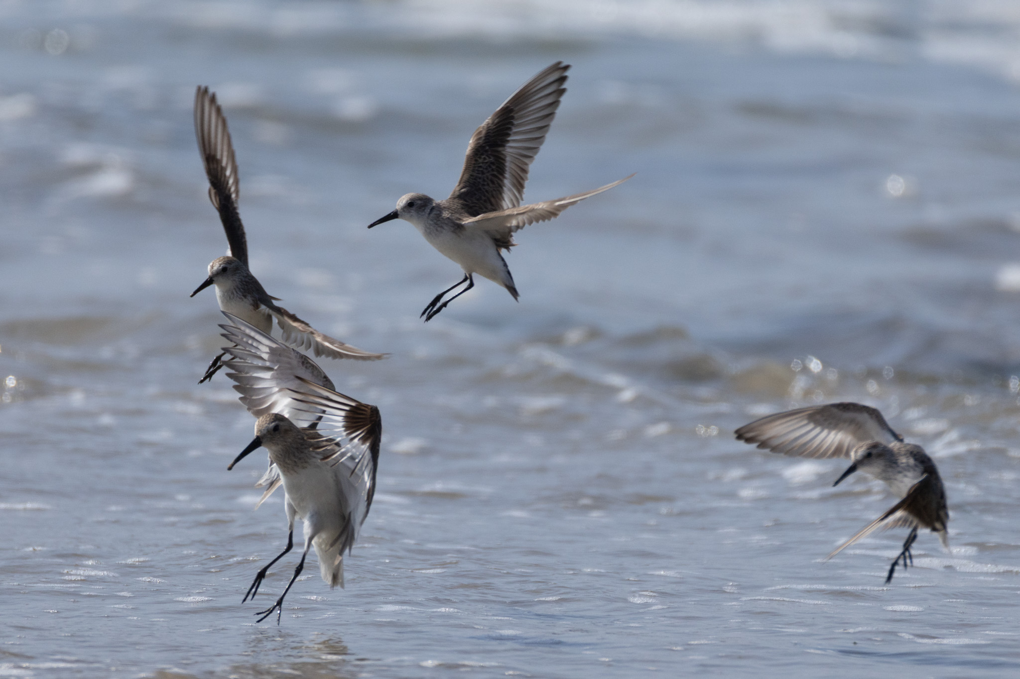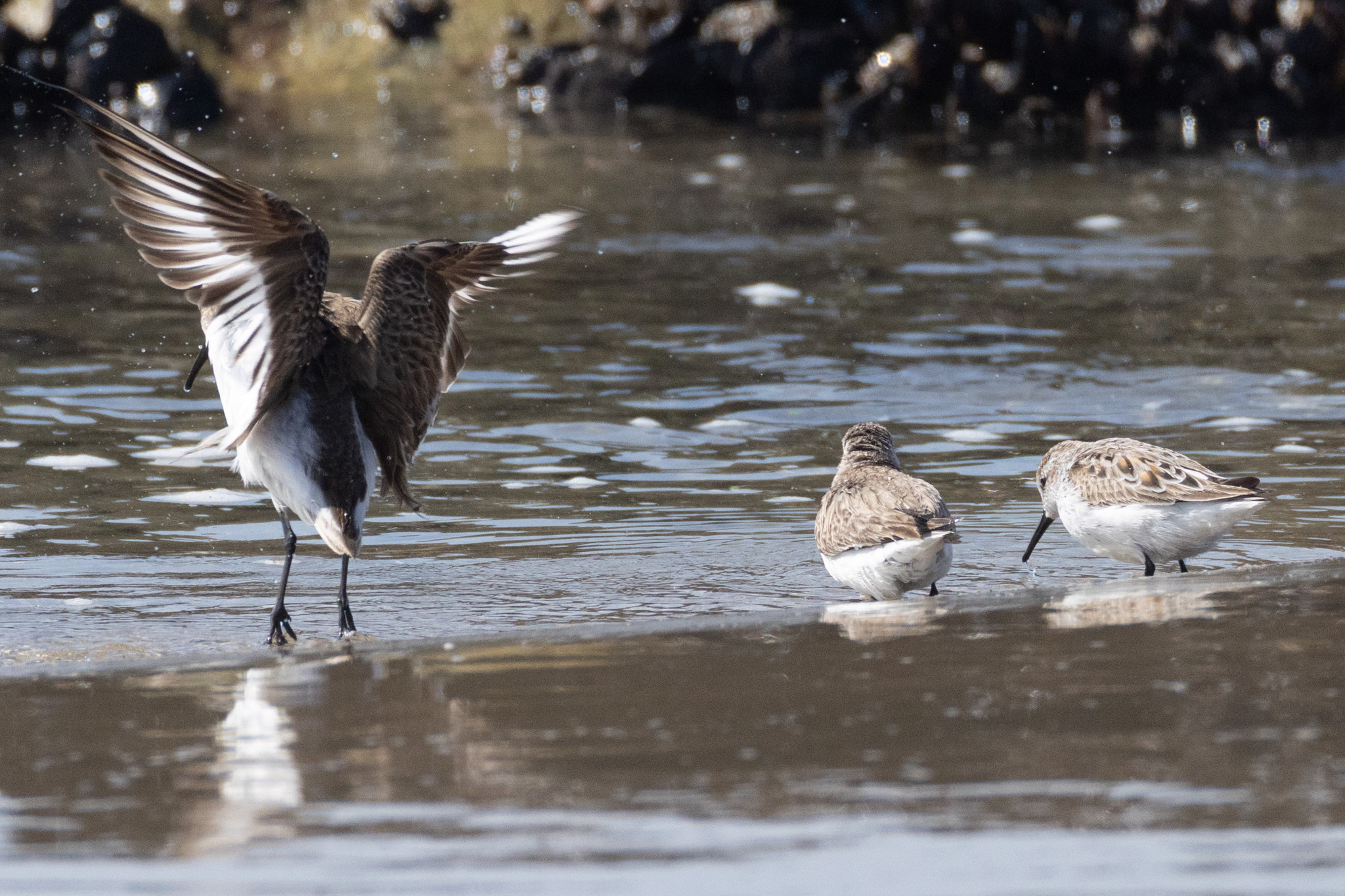 As the inshore mussel-encrusted rocks emerged from the descending tide, more birds flocked to them.
