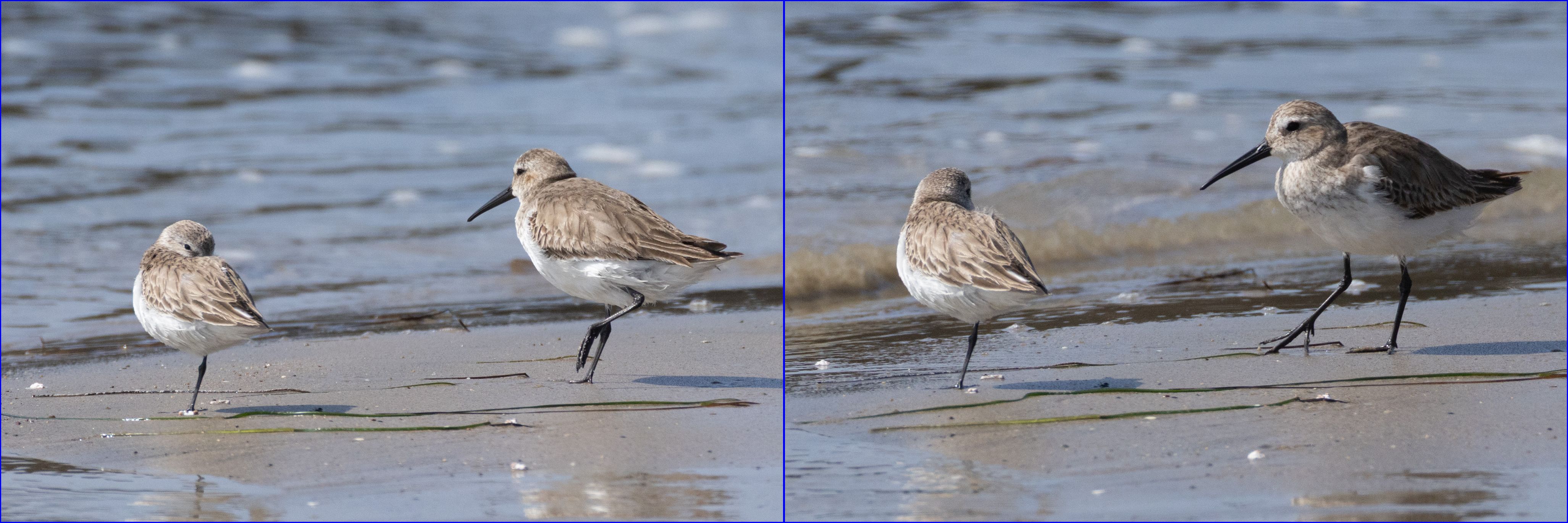 The smaller ones are Western Sandpipers which are 6.5″ long, but what exactly was the larger one with the larger, droopier bill? The next-larger peeps from Westerns are the Baird’s or White-rumped at 7.5″, but they have short bills and aren’t here in March (White-rumped is an eastern bird, less-than-casual and only in summer). Next up are Curlew and Stilt Sandpipers and Dunlin, all at 8.5″, and all have longish droopy bills. Sandpipers slightly larger than that have relatively short bills. So our “larger bird” should be a Dunlin, Curlew or Stilt Sandpiper. Stilt Sandpiper looks more slender and the visible tibia (between belly and tibiotarsus joint (the “backward knee”) is longer, these two features combining to give it that “stilty” look, so that narrowed it down to Dunlin or Curlew Sandpiper. Of the two, Dunlin is far more common, as the Curlew is an Eurasian bird occasionally showing up on both east and west coast.