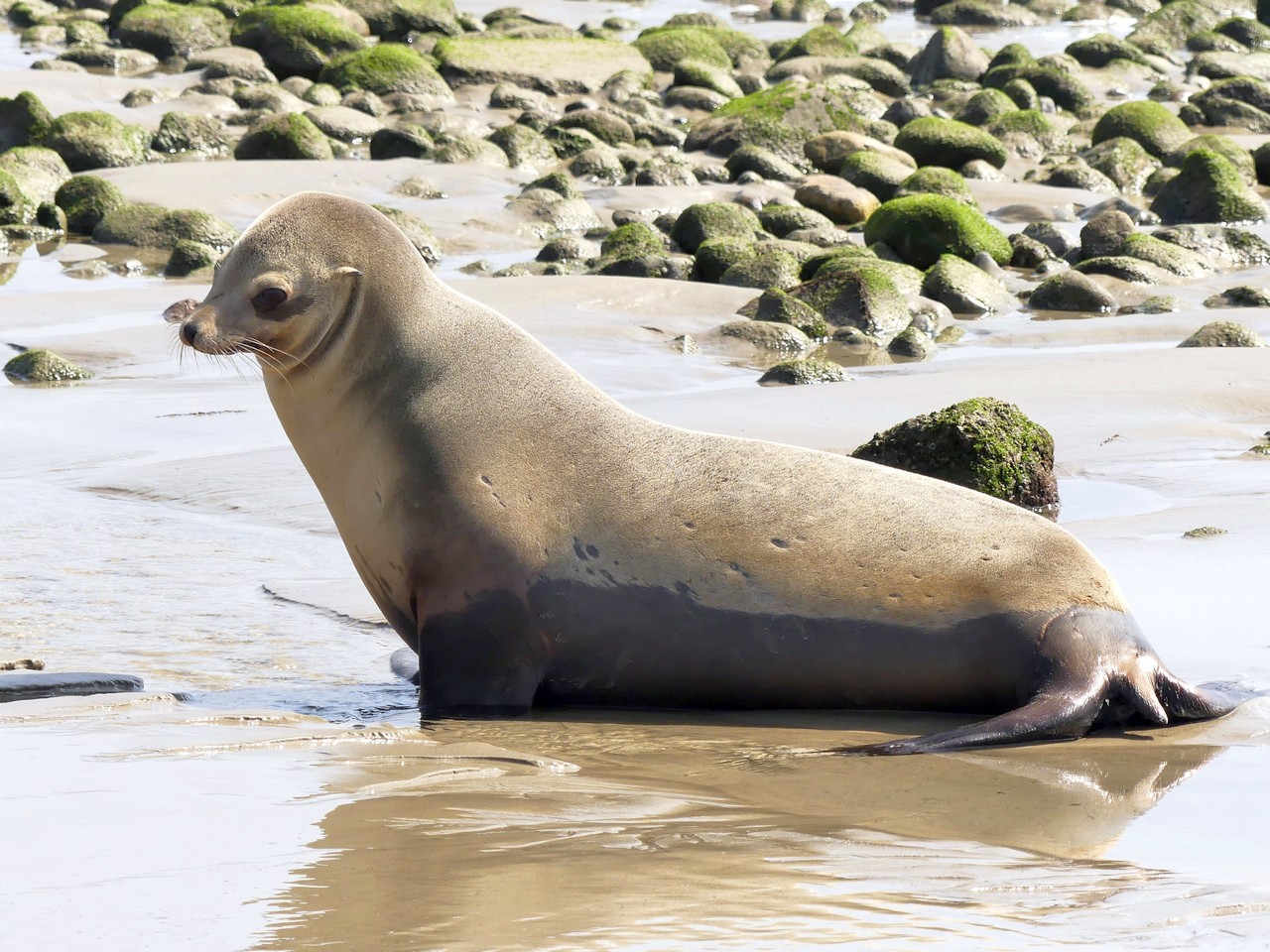 Around noon between inshore rocky areas we found this sea lion up on the sand, an uncommon sight. Sometimes they pull out onto the offshore rocks, but rarely onto the sand or inshore rocks. It was also acting strangely, swiveling its head and neck in a figure-8 manner. Close (through binoculars) examination revealed a fringe of foam around its mouth.