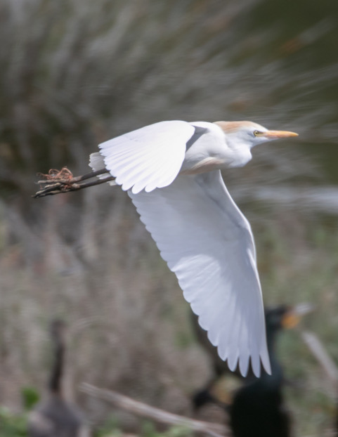Besides the shortish yellow bill and the dark legs and feet and the relatively small overall size, they have these rusty areas on head and breast in breeding plumage. The excitement began when a Snowy Egret began chasing the Cattle Egret all around the lagoon. It looked pretty aggressive about it and this went on for perhaps five minutes with lots of swooping, hairpin turns and twists, and diving.
