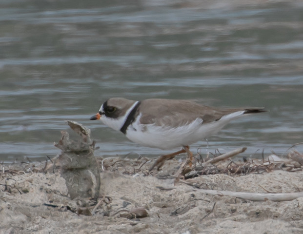 Semipalmated Plovers (below) are a regular spring and fall migrant stopover at the lagoon. My first record of them was 13 birds on 7 Sep 1980. Since then I’ve counted 523 birds on 86 occasions, averaging 6 birds per visit. They’ve appeared in all months except June, but the numbers are clearly skewed. 52 (9.9%) showed up in the nine months of October through March and May through July. April has 291 birds (55.6%), August 102 (19.5%) , and September 78 (14.9%). As I said…a spring and fall migrant. They are “semipalmated” for the same reason that Semipalmated Sandpipers (and Western Sandpipers as well) are semipalmated, and you can see the toe webbing just about equally poorly on all three species.