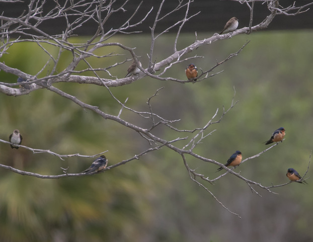 The swallows have definitely arrived. One of their favorite perches is this medium-sized leafless tree by the west end of the PCH bridge, and nine are in this photo. Barn Swallows are the rusty ones, Northern Rough-winged Swallow are the dull brown-back, pale-belly ones, “distinguished by their lack of distinguishing characteristics” among the swallows. The five Violet-green Swallows were confining themselves to the north side of the bridge over the deeper pools of water, and the Cliff Swallows were scattered hither and yon. I discovered that the Barn Swallows were using the bird outlines carved into the cement bridge supports as safe and secluded resting shelves.