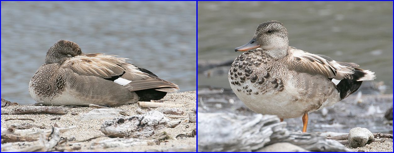 Marsha captured a resting pair of Gadwall. With her camera. Sometimes the orange on the female’s bill is just a thin strip along the bill’s edge – orange lips, so to speak. This one has a bit more than that.
