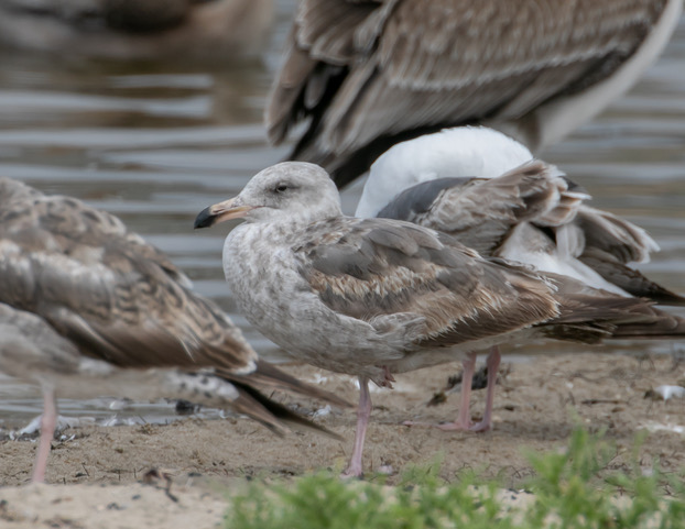 We debated about this bird (below, in the middle) on the beach, deciding it likely was a Herring Gull. Chris thought two-years old. After looking at the picture, I think it’s molting into 3rd year plumage. The wing-coverts are quite worn, giving it that “shredded” look. The bill is less chunky than the Western’s (two pictures up), the head looks a bit flat and no white mirrors in the primaries. Pink legs of course.