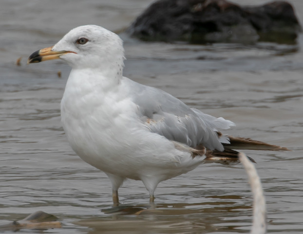 Ring-billed Gulls can be tricky. Young birds can have an all-black, or partially-black bill. As they age the black area turn yellow-pink-orange at different rates and in different patterns. The base of the bill generally changes color earlier than the tip. In the bird below, the tips is minutely pale at the very tip. They eyes also begin as dark, then turn very pale by the time they’re adult at the ripe old age of three.