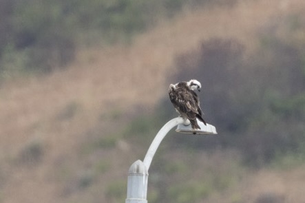As you’ll see by the photographs, the day was gray, sometimes, depending on which way you looked. To the north, bluish sky, to the south, gray-grim. We were quite surprised to see the Osprey on a light pole over Pacific Coast Hwy., as he or she normally prefers the wooden telephone pole at the back of the colony. We then realized that the wooden pole was completely gone. They’re putting in a new house at the back corner of the colony, and the pole was in the way. I suppose. Too bad – that pole was a favorite perch for birds. The Northern Mockingbird stood there for years, tootling away. More recently the Osprey commandeered it and ate many a fish on the top. Occasionally a Red-tailed Hawk would rest there, but the last time one did a group of Ravens drove it off.