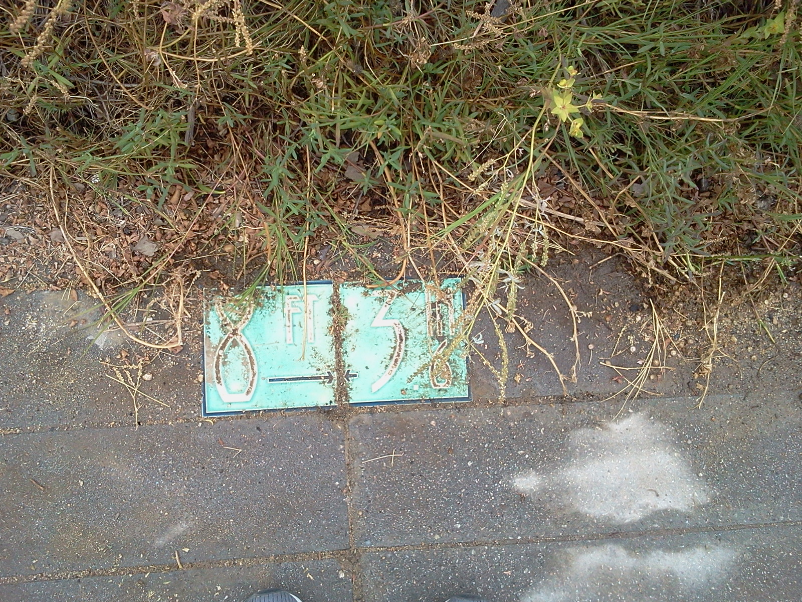 Tiles spaced along the sidewalk tell you the water height. The out-of-picture water’s edge was just below this marker.