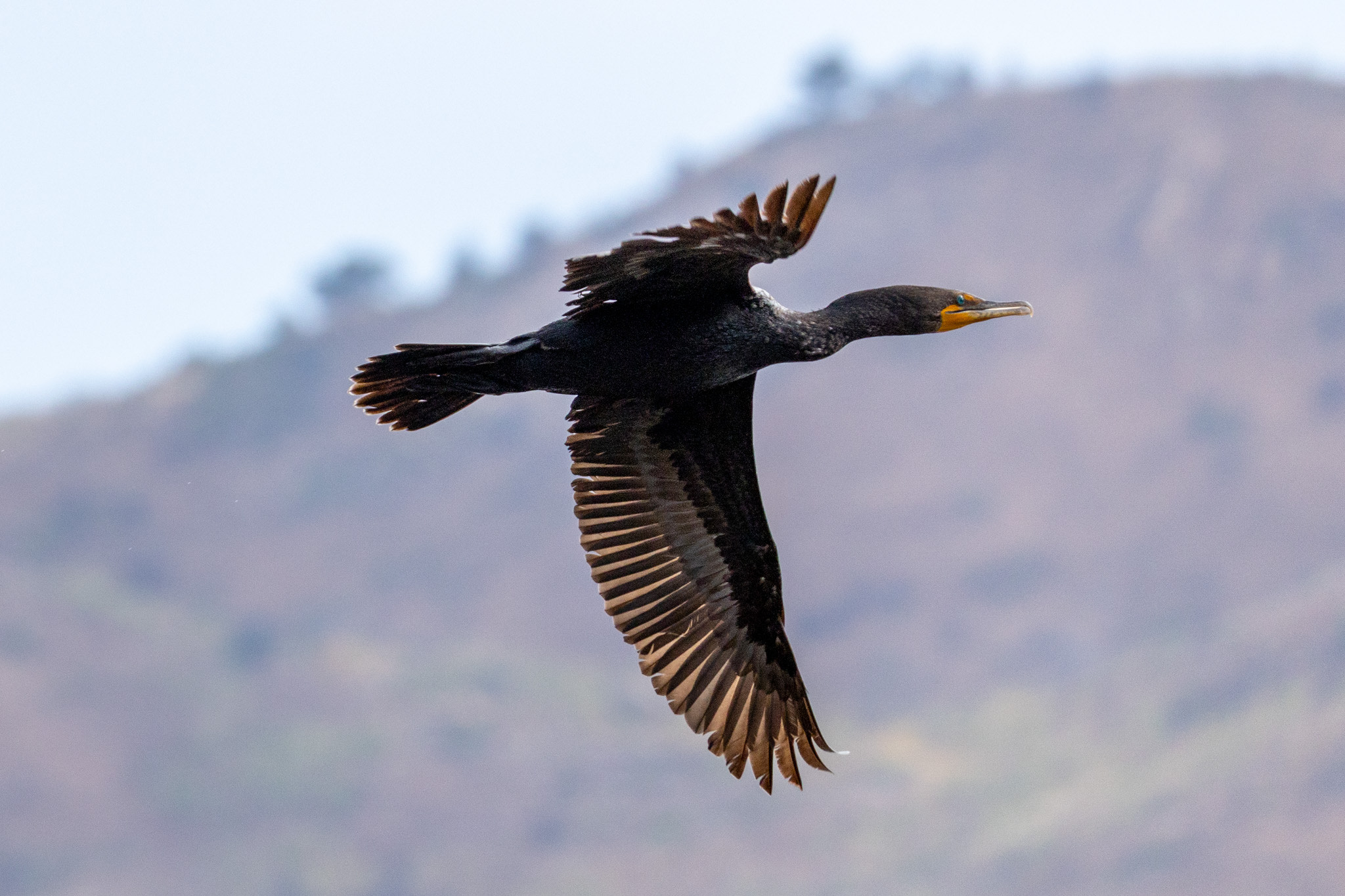 It can be very hard to identify distant flying cormorants, but this crook in the neck ID’s this bird below as Double-crested. As the currently-range-expanding Neotropical Cormorant is very similar, albeit smaller, I like to point out that it does not have that little bit of orange flesh over the eye that you can see on this bird.
