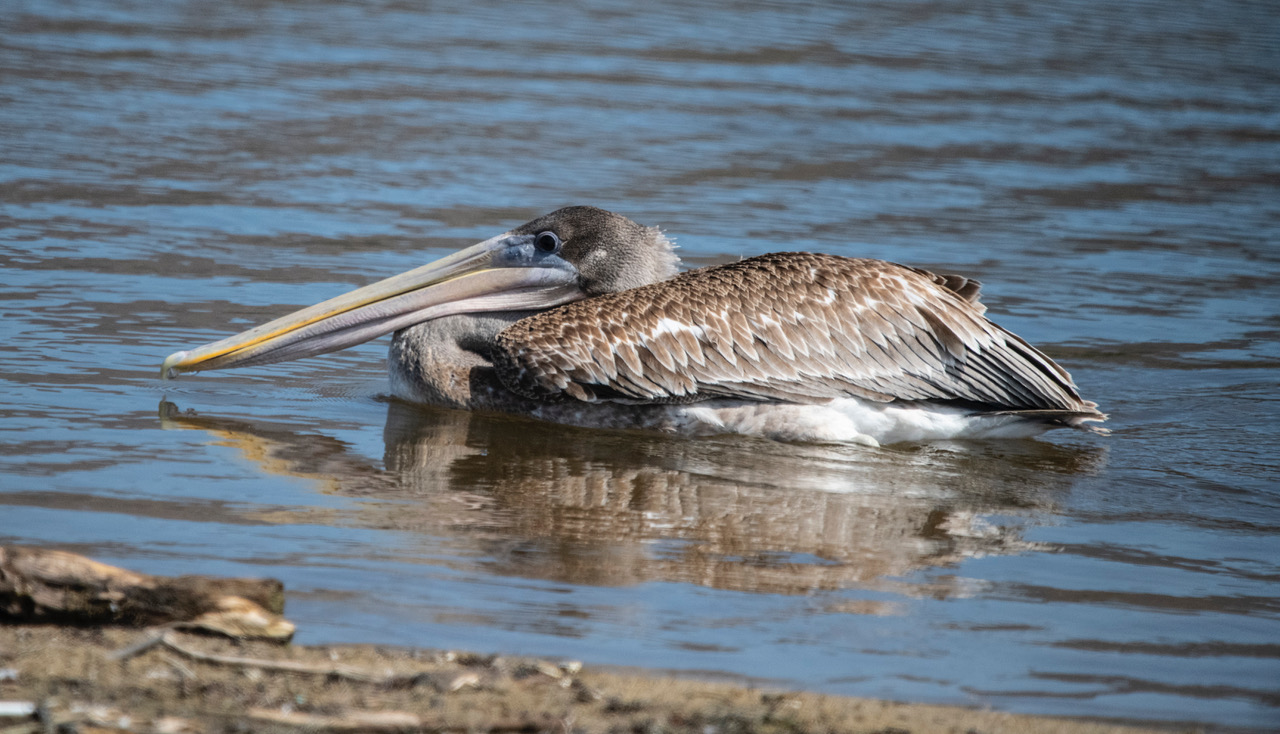 It’s just an optical illusion that this pelican poked its bill clear through its wing.