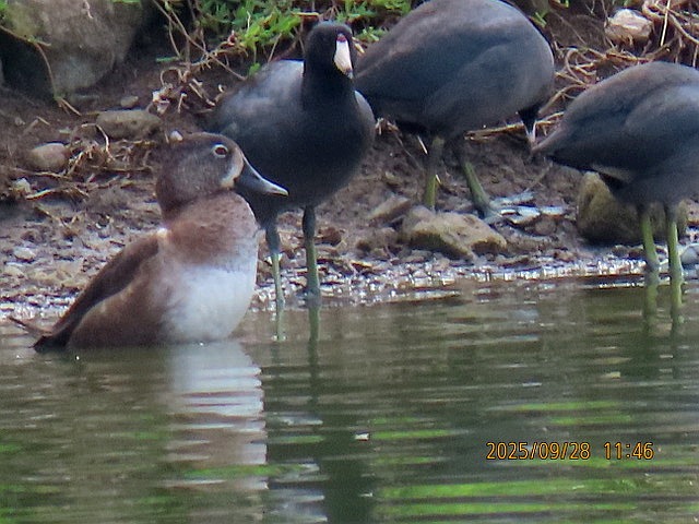 The second detail is the vertical white breast-to-shoulder mark. Again, in most male Ring-necks we see, this mark is the first thing we notice, but it’s barely visible here. Also visible, barely, was a hint of white line running back from the white eye-ring, just barely noticeable in the photo. I think this is a juvenile male or male in eclipse, but I’m not putting any money on which. This species is rare at the lagoon according to eBird and my numbers below support that [bracketed bird below, other ducks shown for comparison]. We’ve now seen them a whopping nine times, total of 19 birds, since October 1979, a mere 46 years. My experience with them is they prefer fresh water, and the lagoon is probably too brackish or salty for them, so if they drop in, they soon leave and no one sees them.