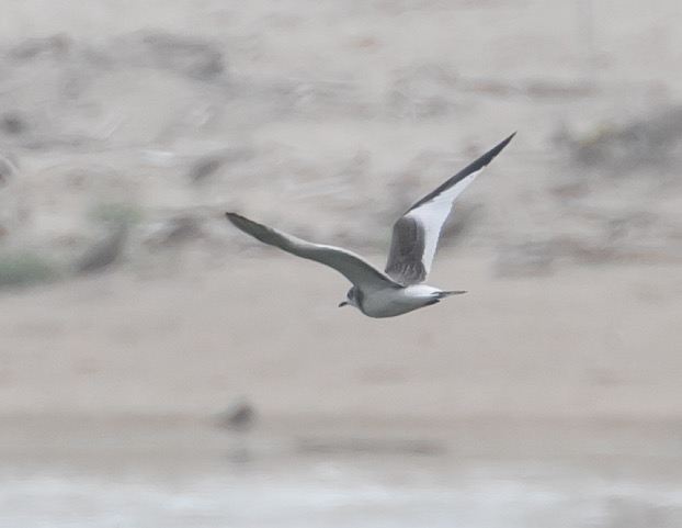 With wings folded, the back looks almost scaly, or barred. But if you haven’t figured it out by now, here (below) it is flying away. This – in my opinion – is the most distinctive flight pattern among the world’s gulls, although I didn’t actually scan through pictures of all 50+ species to support that statement.