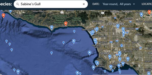 Sabine’s Gull Xema sabini, is the only gull in its genus, quite unlike the Larus genus which has 25 species and is by far the most common genus of gulls. It is pelagic, breeds in the Arctic and winters on the open tropical seas, and it rarely comes to land except to nest, although some use the central flyway to fly south in the fall. I don’t think I’ve ever before seen one from land, and all my sightings were from pelagic boat trips out past the Channel Islands. Knowing that, I find it very odd that it actually is sighted inland with some regularity, as you can see by the eBird sighting map below. My hypothesis is that it has such a distinctive flight wing-pattern that if a birder can see it, they can ID it, unlike all those Larus genus gulls flying over our houses all day long.