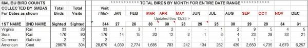 | Totals Birds | 325 | 517 | 459 | 631 | 761 | 553 | |