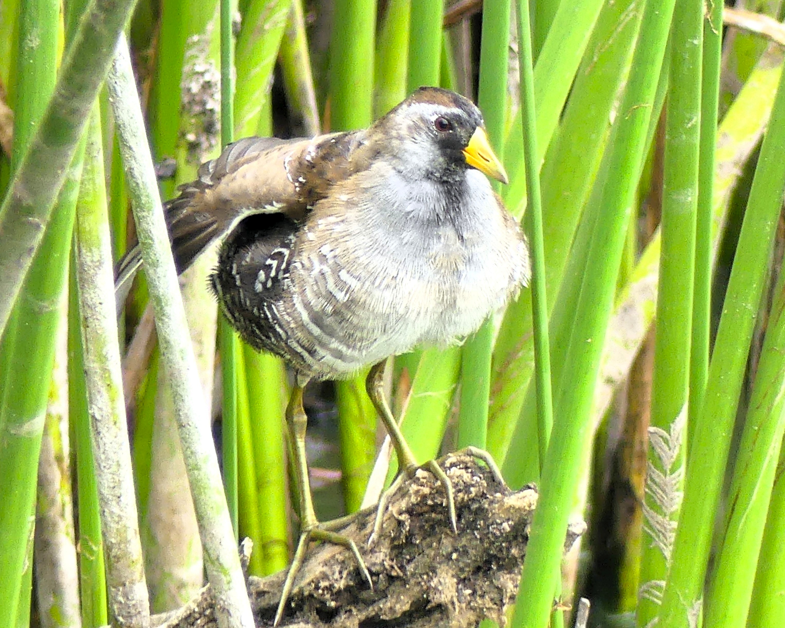 Hours later, when we got back to our starting point from the other side of the lagoon, there were still people staring at the reeds. I asked how it was going, they said the bird had disappeared and they were waiting for it to pop out, so I went and checked the other side of the very small reed bed, where there’s a 20-foot gap of “open water” invisible from where everyone was standing, and…lo and behold…there was the Sora, walking on the mud, right out “in the open” if you stood in the right spot. I alerted the group and a few more people got to see it. When you’ve seen dozens of Soras, you get used to the fact that they frequently and quickly disappear into the reeds only to – voilà, like magic – reappear elsewhere. Here we have two photos of the same bird, same location, same chunk of wood, but different brightness and positions.