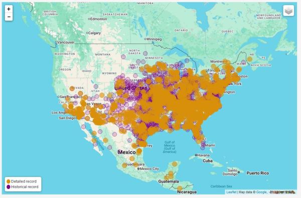The American Snout Butterfly is far less common in the west than in the east (see below). Butterflies and Moths has a nice write-up this medium-small butterfly (1 3/8 – 2″) wingspan, with much the same information on Wikipedia. Most of us have never seen this butterfly before.