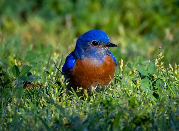 The grass was wet with dew, as usual. I hoped to find a nice bunch of sparrows feeding, but nearly all were White-crowned, who have been here all winter. Several pairs of Western Bluebirds and California Towhees and a single Lark Sparrow did appear on the lawn.