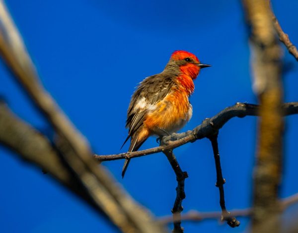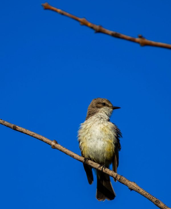It was, however, hanging out near the tree where I’d seen a male Vermilion Flycatcher about 20 minutes earlier on my brief scouting foray. Soon enough the male appeared and while they weren’t obviously paired up, they didn’t seem adverse to each other’s presence in the same tree. It’s easier to ID the female when you see her next to the male. Same size, same profile, same bill and crown shape. If you look at the belly of the male below, you can see some yellow in the same location as on the female.