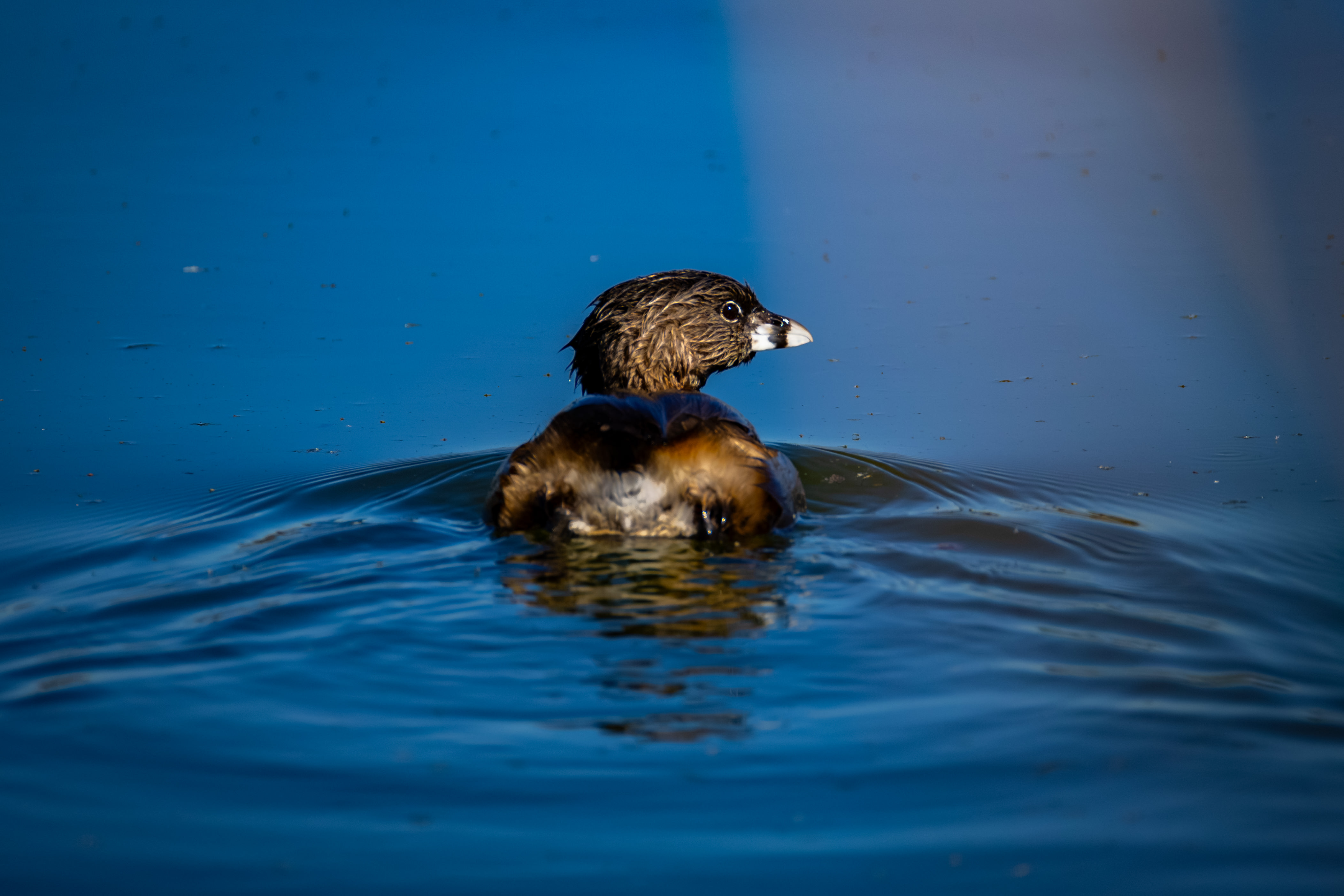 The “pied” of Pied-billed Grebe is one of those words that the British naturalists and bird-namers scattered around when exploring the world outside Britain. “Parti-colored” (consisting of two or more different colors) would also work, but “pied” seems to be applied primarily to two colors, in this case black-and-white, or more accurately dark-and-light. Other such Britishisms are lark, tit, warbler, coot. Works for me.