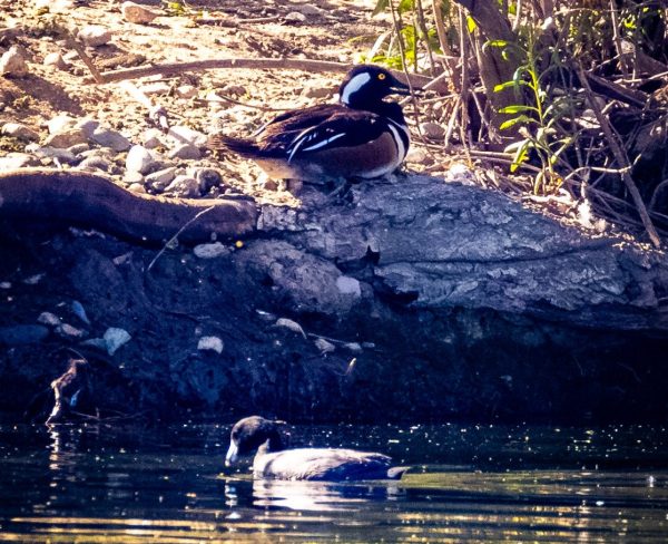 Hooded Merganser, if they are there at all, are usually tucked under the overhanging vegetation on the north side of the peninsula north of the island. I’ve never seen more than two at a time, usually a singleton. This male was relatively in the open on the north edge of the island, easily seen by all except those who wandered onward before we spotted it in the shade.