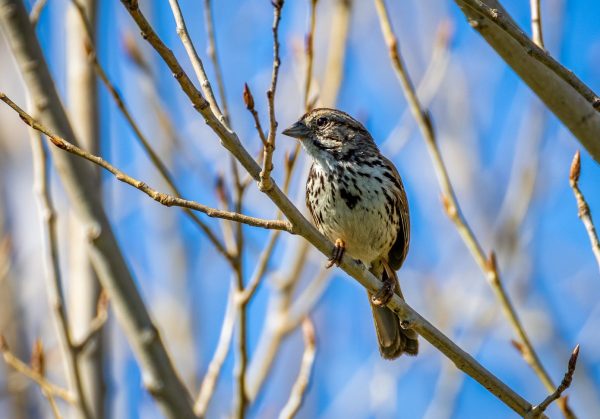 Another busy songster was the Song Sparrow, tootling away from nearly every tree or bush. Once you familiarize yourself with the basic three-section pattern of their songs, they’re easy to recognize.