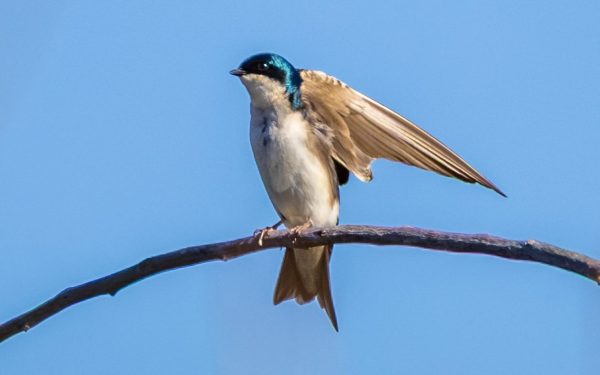 Last year we had five species of swallow; for a long while this year we had none at all until a flock of glossy-dark-blue-backed Tree Swallows flew in and crisscrossed the pond for a while, catching flies. On this perched bird you can easily see the dark feathering surrounding the dark eye. On the similar Violet-green swallow, the white on the throat comes up the cheek and over the eye.