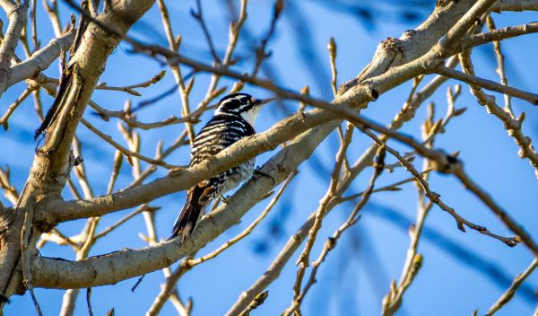 Several pairs of Nuttall’s Woodpecker were seen, in addition to one Downy Woodpecker working the same tree as one of the pair. The pattern of black-and-white of the face, the wide black shoulder on the striped back ID this as a Nuttall’s and not a Ladder-backed (ignoring the fact that no self-respecting Ladder-backed would leave their beloved desert), and the lack of red on the crown ID’s it as a female. They all “spoke not a word but went straight to their work.”