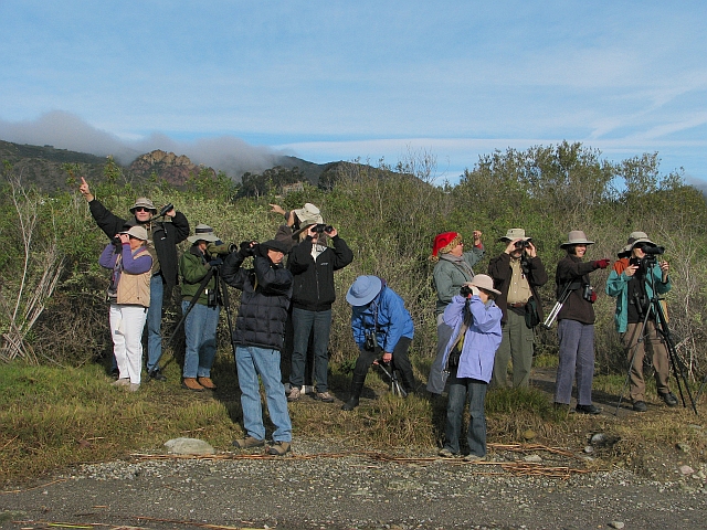 1. Scope: If you have a scope, it’s easy to put it on the bird and let others look through it. This works well with birds like shorebirds, ducks or resting raptors who don’t move around quickly; it’s nearly useless with birds flitting through foliage. When the bird is cryptic, partially hidden or distant and small, give useful additional hints: look in the upper left portion of the field of view; behind that vertical snag, at the base of the red rock. Knowing which part of the scope’s view contains the bird can quickly ensure a useful look. (When a group of people are waiting to use the scope, it’s good birding etiquette to take the briefest look possible, yet still see the bird. However, if you just can’t find the bird in a “reasonable” amount of time, move aside and let others take a first quick look, before returning to the scope to try again. Second looks are for lingering.) If people of widely varying heights will likely be using your scope, the 45°-angled eyepiece is easiest for everyone, especially tall people who won’t have to stoop so much.