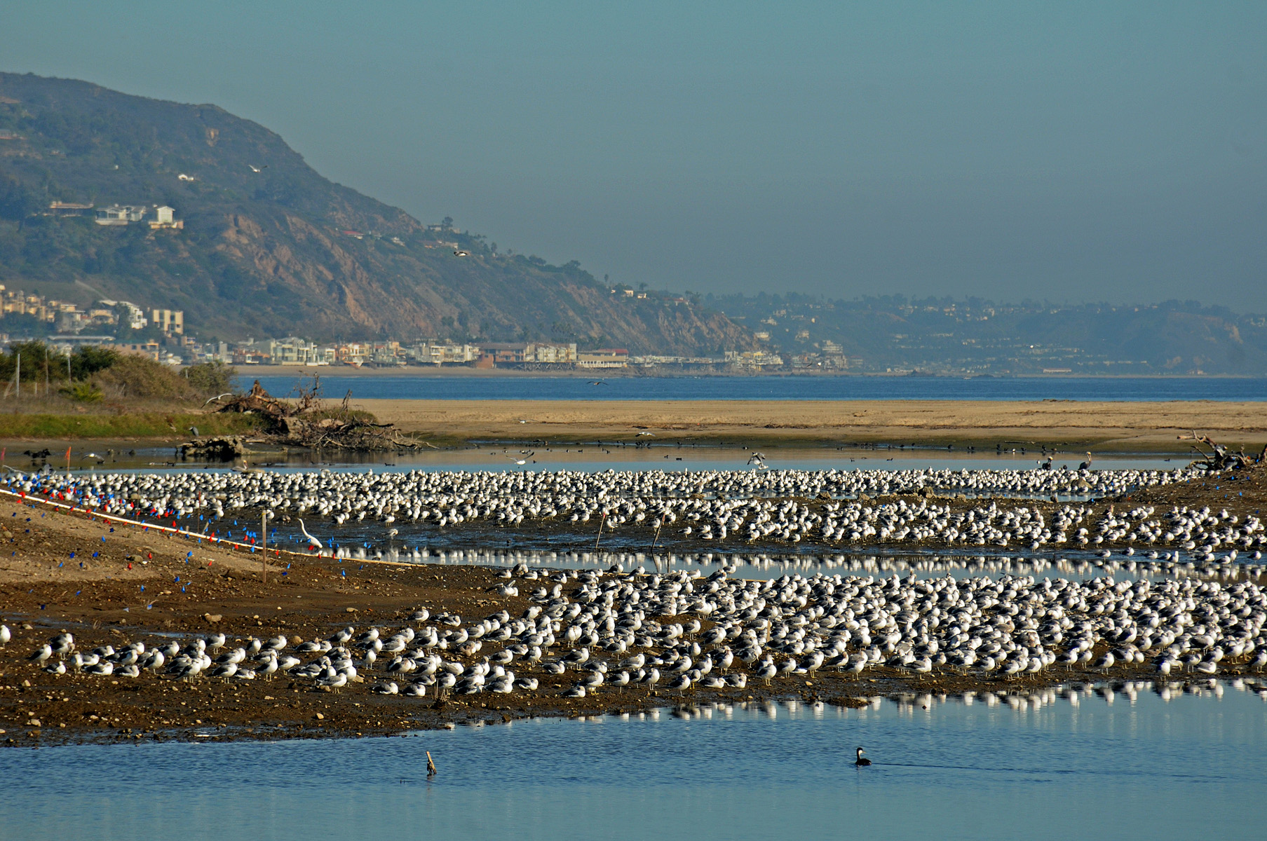 The large flock of gulls which appeared on the islands and mud flats of the breached lagoon was widely reported within the Los Angeles birding community.