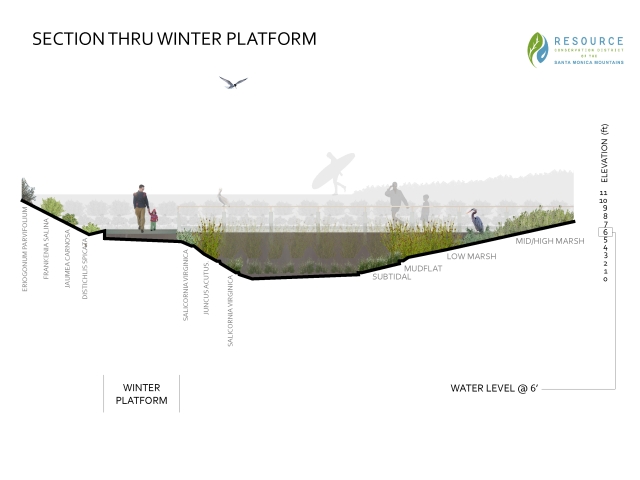 Note that the “winter platform”, the viewing platform at the lowest point of the ramp system, is at 6.5 feet ASL. This was carefully chosen so that only a very few of the winter (open tidal condition) tides will reach that level, and only about 4 per year (king tides) would allow you to have wet feet. Therefore, the banded “arboretum” plants are only wet for periods during the dry season.