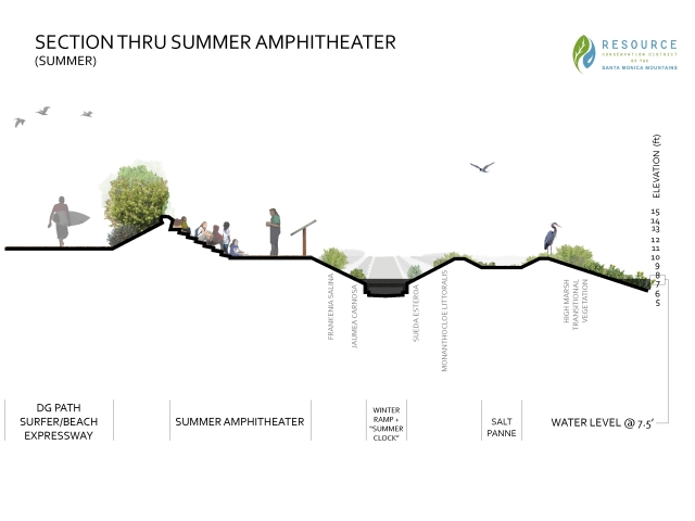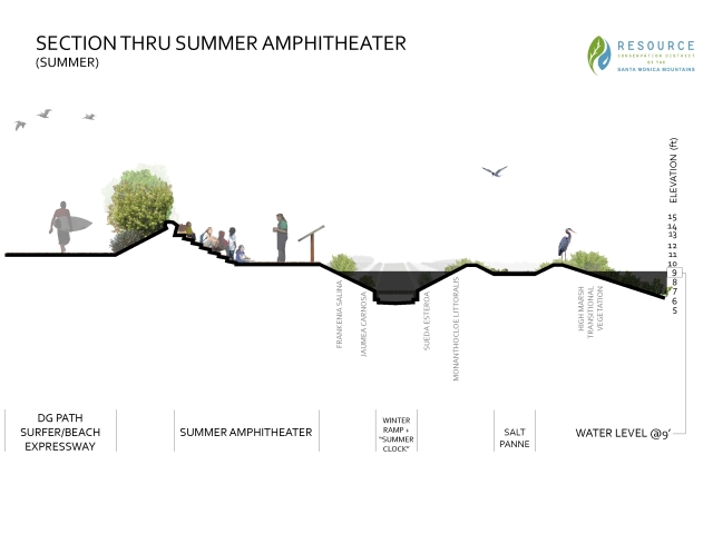 One feature has generated a number of questions: The winter ramp, or summer clock- they are one and the same, but change functions and names each spring and fall. When the lagoon is open to the tides, the winter ramp will take you down into the heart of the tidal range. But in the spring- like now- after the building sands succeed in blocking the dwindling flows of Malibu creek from reaching the high tides, this same path will become the summer clock, marking the passage of time as the waters advance four feet up the shallow ramp for every inch that the lagoon rises.