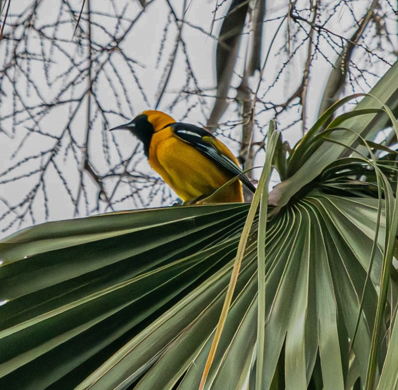 We walked up to the residence (for you bar-trivia enthusiasts, it’s one of the locations where they filmed the TV show “The Biggest Loser”). Standing among the maintenance vehicles was a larger than life-size plastic Gentoo Penguin and a Pneumatic Roof-Owl. More to our liking were several Hooded Orioles, possibly looking to make nests in the palm trees,