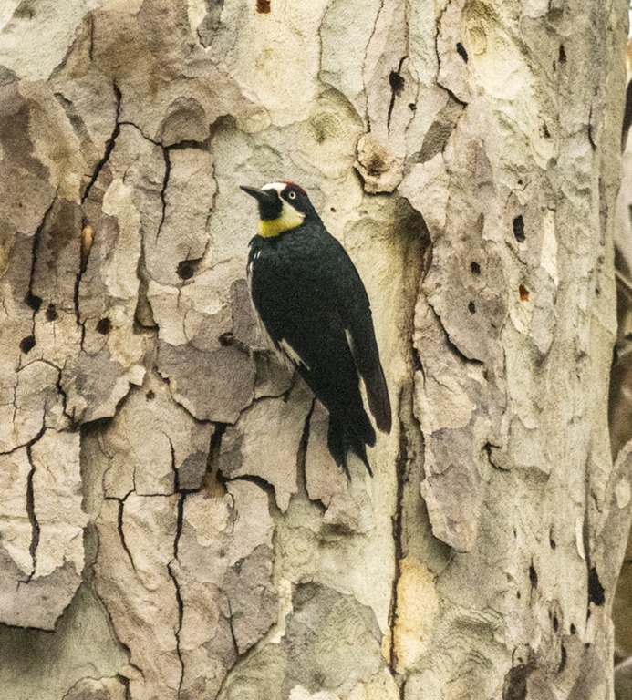 The raucous calls came from Acorn Woodpeckers and Nanday Parakeets. There were numerous trees that were serving as acorn storage – ACWO’s peck the holes, one for each acorn, for future food use. They also have the most interesting family lives and habits – you can read a brief description of them at https://www.allaboutbirds.org/guide/Acorn_Woodpecker/overview.
