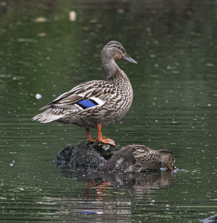 Female Mallard (Anas platyrhynchos) with one of her two remaining ducklings.