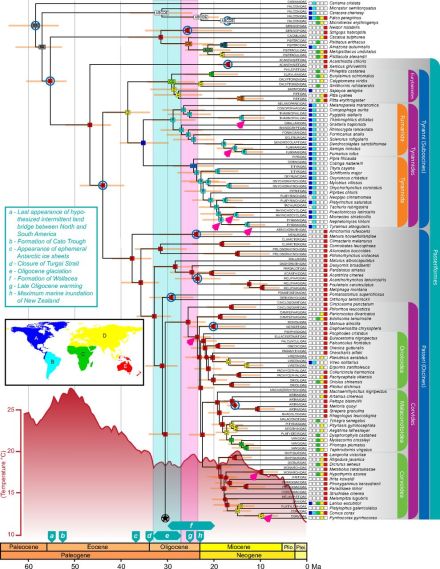 - Split between oscines and suboscines ∼44 Ma, occurs well before the appearance of ephemeral ice sheets in Antarctica during Late Eocene, which would have made the trans-Antarctic route implausible.