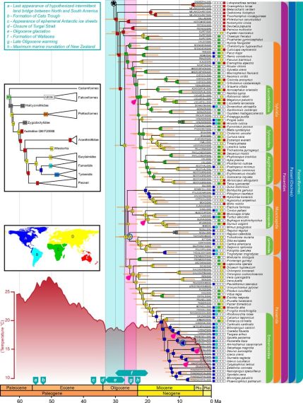 - Subsequent dispersal and diversification of passerines affected by a number of climatological and geological events, such as Oligocene glaciation and inundation of the New Zealand landmass.